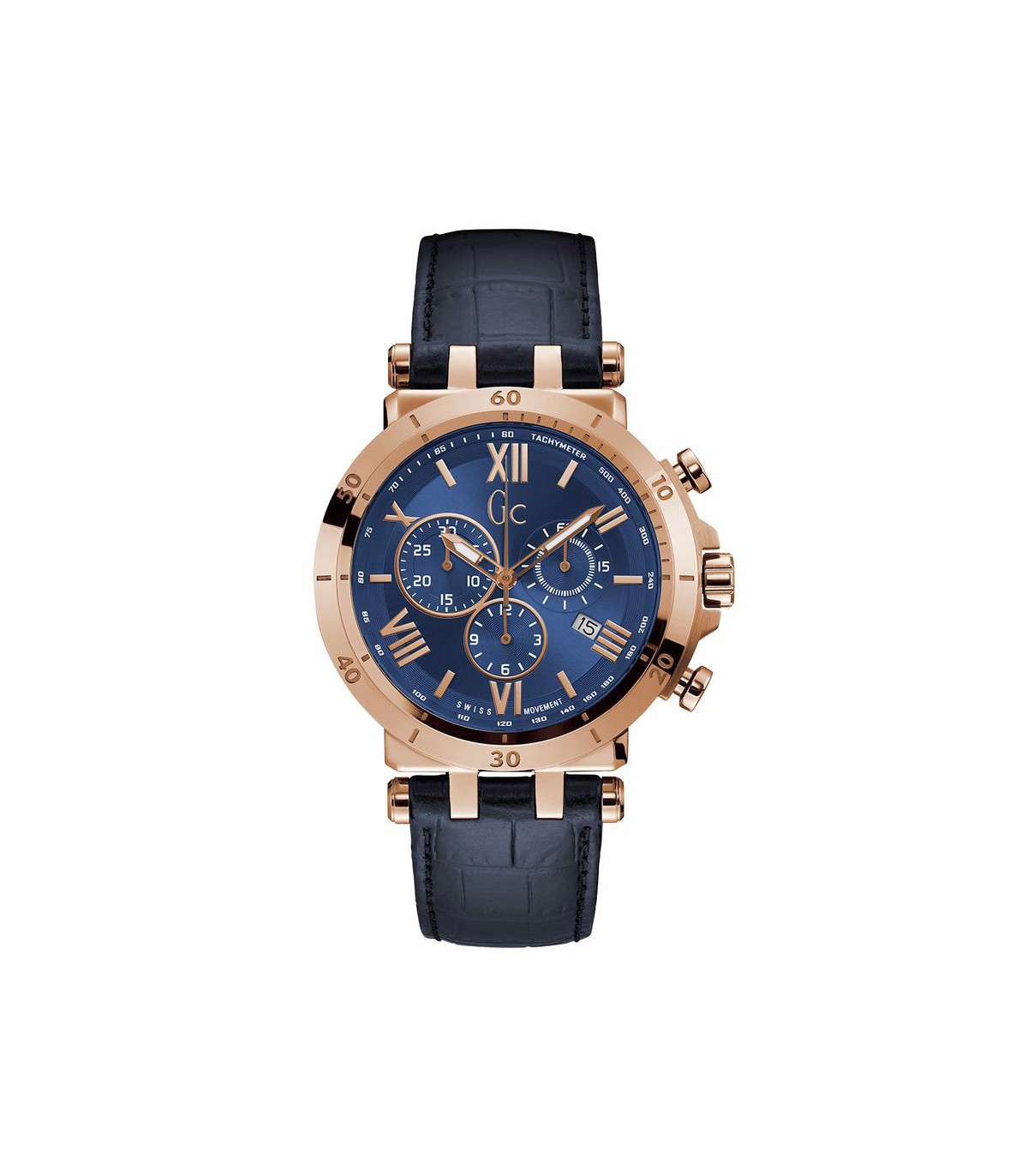 Reloj pulsera caballero GC. Caja en acero IP Rosé. Esfera azul con indices y agujas en rosé. Diametro 44MM. movimiento cuarzo suizo. Cronografo, calendario. Resistencia al agua 10 ATM. Correa en piel azul. Cristal de zafiro.