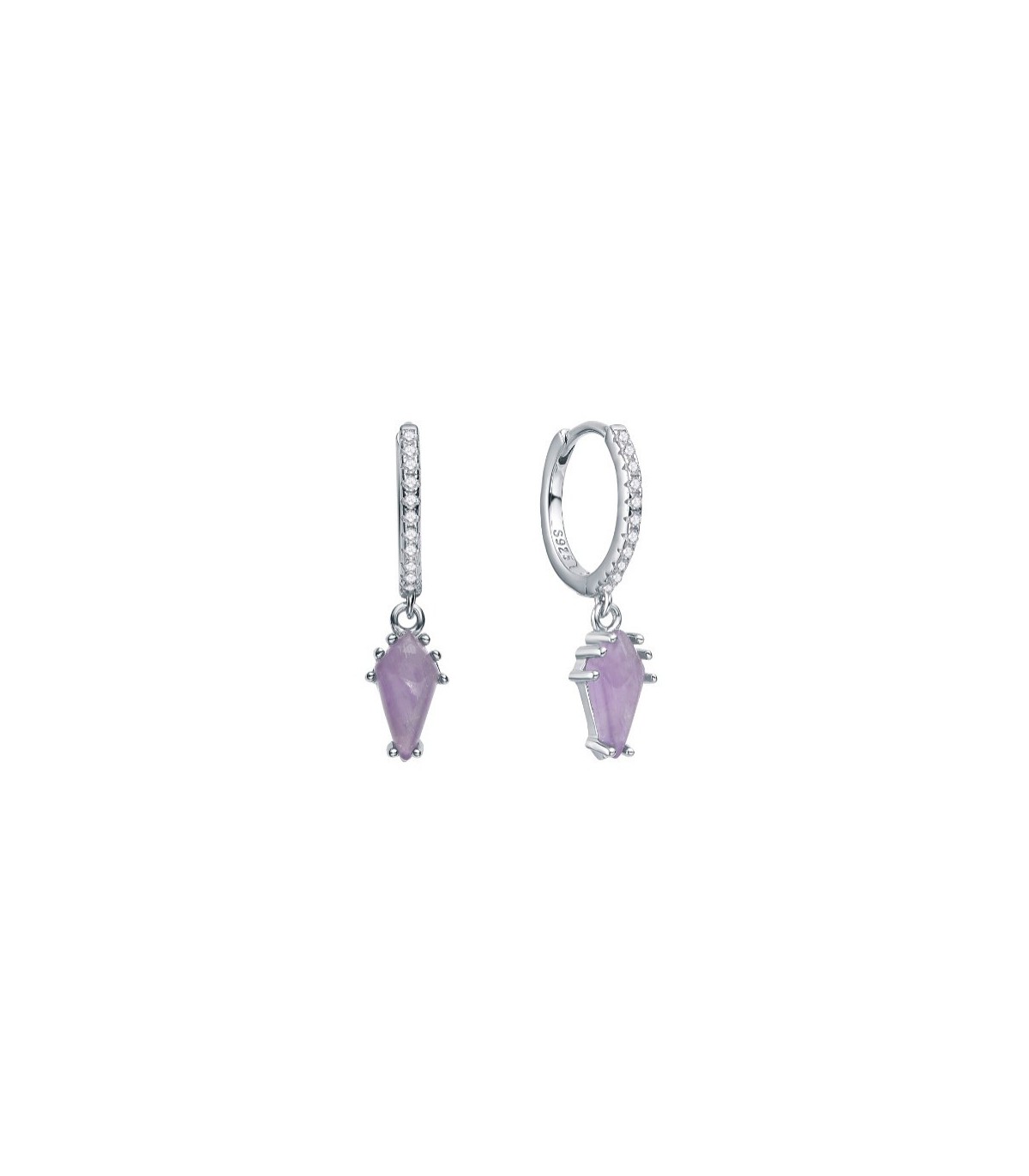 Pendientes de aro en plata con colgante amatista y circonitas transparentes.