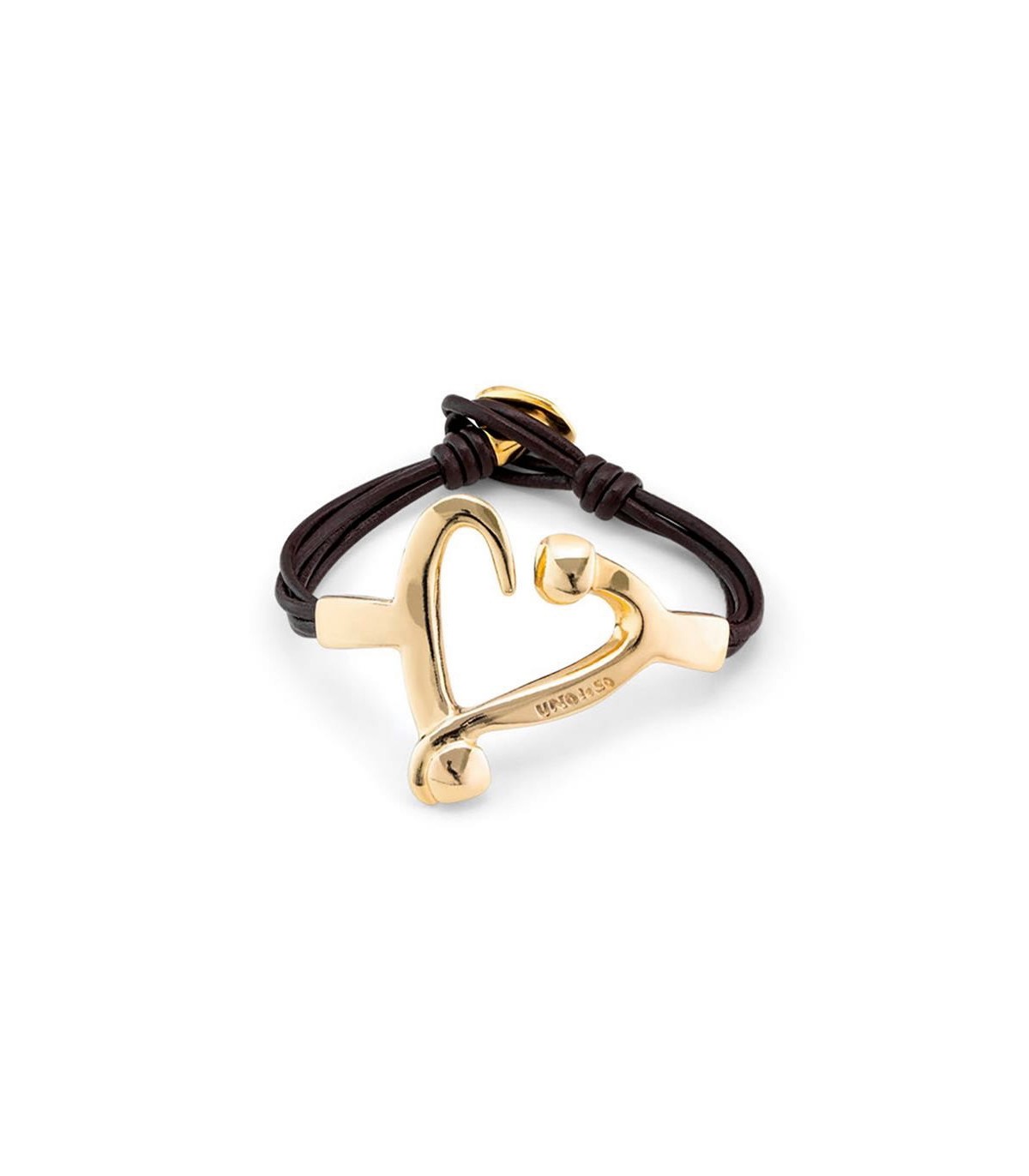 Pulsera Loved compuesta por 4 tiras de cuero negro que dan lugar a un abalorio central en forma de corazón clavado con cierre de boton.