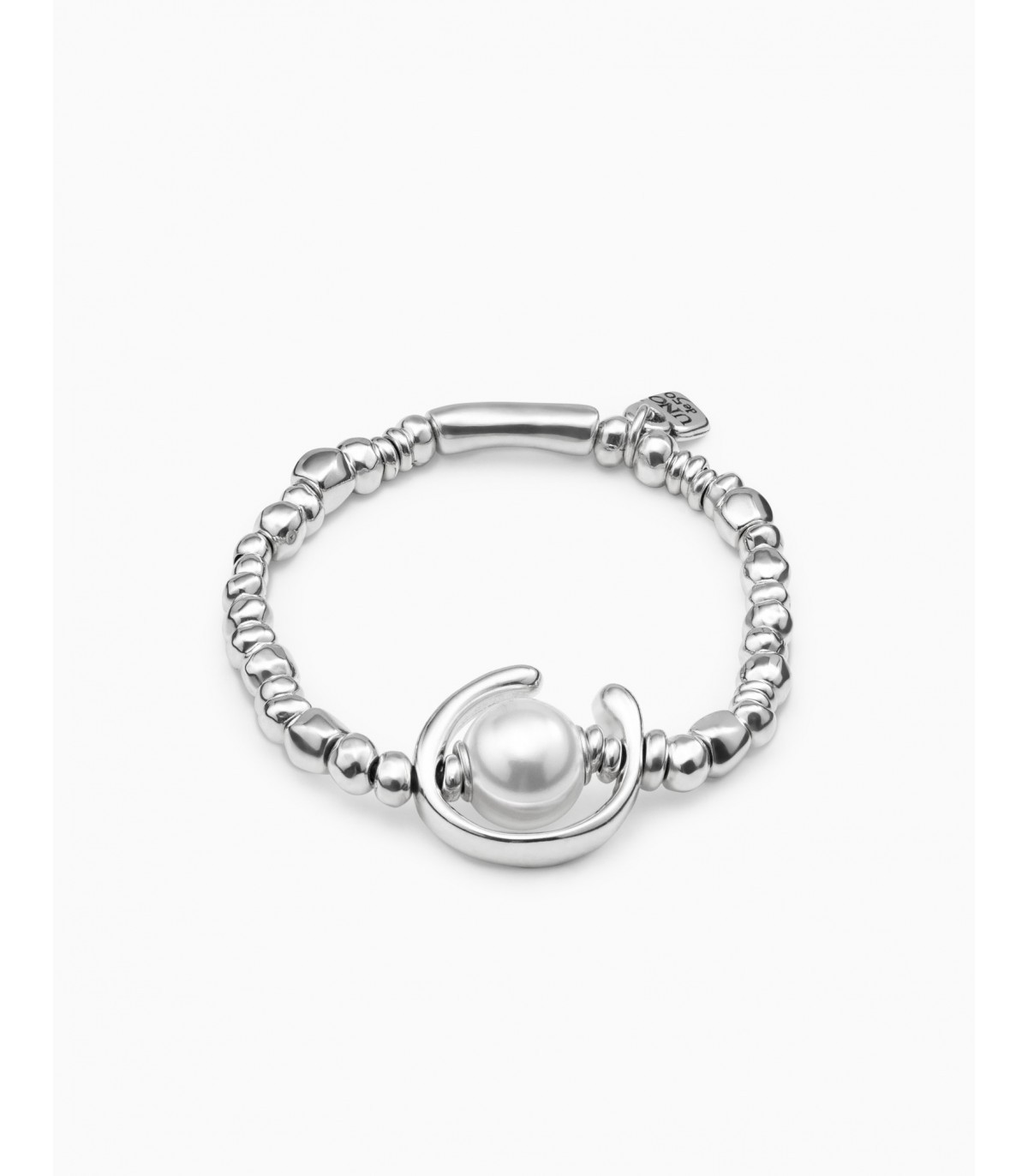 Pulsera UNO de 50 de diseño único elástica realizada con abalorios de forma redondeada que combina un aro bañado en plata y una perla blanca.