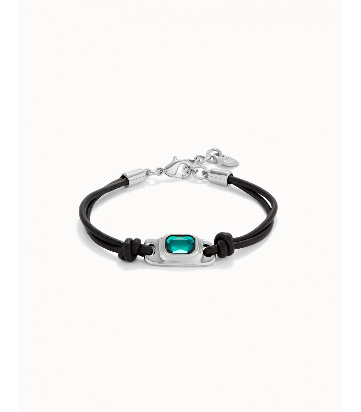 Pulsera UNOde50 en cuero negro y cristal facetado en verde.